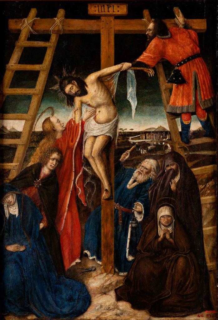 Esta pintura es muy interesante desde el punto de vista estilístico. Las figuras se distribuyen en el espacio pictórico de una forma muy pensada, aprovechando el eje de simetría que generan la cruz y las dos escaleras, en el momento justo de descender el cuerpo de Jesús. La representación minuciosa de los detalles y la abertura en el fondo de un paisaje que se pierde en la línea del horizonte, así como las vestiduras, los rostros de los personajes y el dramatismo de algunos de ellos son una buena muestra de la gran calidad pictórica de esta pieza.