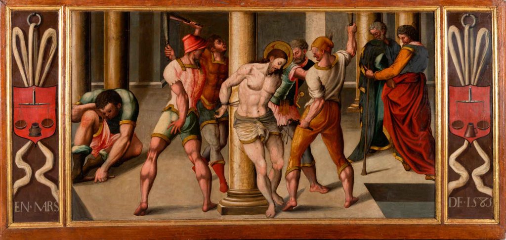 El curioso formato horizontal de esta pintura sobre tabla se explica por el hecho de que, en origen, servía para decorar la parte frontal de un altar. La escena de la Flagelación de Jesús transcurre en el interior de un espacio de aire sencillo pero clásico, dominado por los tonos metálicos de algunas vestiduras y por el tratamiento de las figuras y anatomías, de calidad desigual. Procede de la iglesia barcelonesa de Santa María del Pi, concretamente de la capilla de San Miguel, propiedad del antiguo Gremio de Revendedores de la ciudad. Su emblema, junto con la fecha, aparece en los laterales de la pieza.