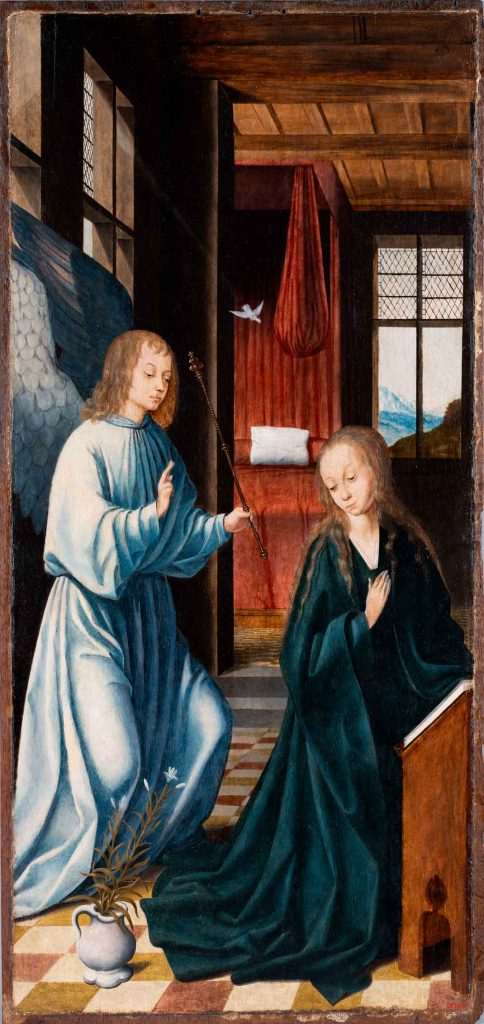 Esta pintura sobre tabla, de escuela flamenca, muestra una representación de la Anunciación que se desarrolla en el interior de una estancia con grandes ventanales. La joven, que hasta hace poco estaba leyendo, recibe la visita sorprendente e inesperada del ángel Gabriel, que le anuncia la buena nueva de su embarazo, al que ella responde con un gesto de serena aceptación, con la mano sobre el pecho. La pintura probablemente formaba parte de un conjunto con la siguiente obra, de dimensiones, formato y estilo idénticos.