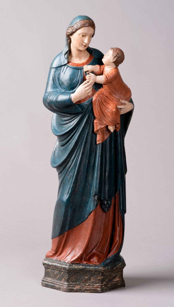 Trapani es una ciudad siciliana que fue muy famosa, precisamente, por la difusión de una imagen de la Virgen con el Niño, del siglo XIV, que acabó generando una iconografía propia. En este caso se trata de una obra en madera policromada, fácilmente identificable, entre otras cosas, por las dos figuras, la relación de afecto que las une y también por los dos pliegues característicos, paralelos, que la túnica forma a un lado.