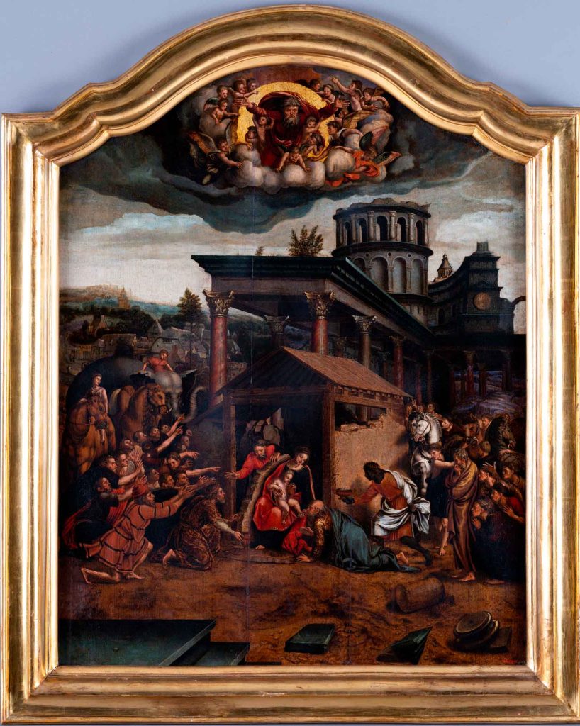 En sentido estricto, desde el punto de vista etimológico, una epifanía es una manifestación, la visualización de una presencia, de una verdad de orden superior. Según el Nuevo Testamento, el nacimiento de Jesús y la posterior llegada y adoración de tres reyes o sabios de Oriente significó el reconocimiento del nacimiento del mesías. La escena presenta una composición rica y compleja, con abundancia de elementos arquitectónicos clasicistas, muchos derribados. Es significativa la aparición volante de la figura de Dios, muy semejante a la misma figura pintada en posición muy similar por Miguel Ángel en el techo de la Capilla Sixtina de Roma.