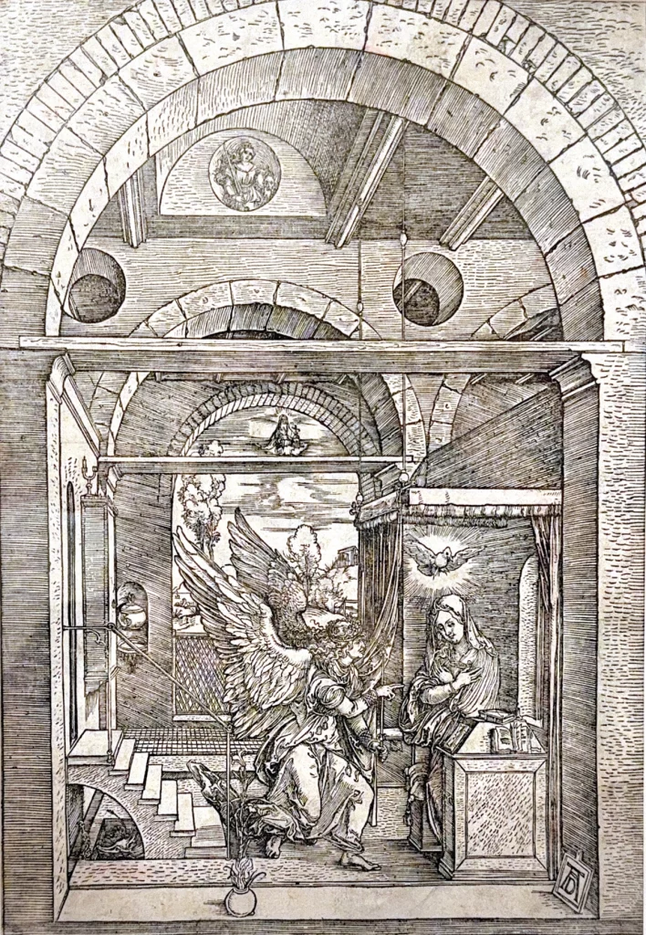 Alberto Durero, el artista más relevante del Renacimiento alemán, realizó entre 1500 y 1511 una serie xilográfica de 16 grabados sobre la vida de la Virgen. En muchos de ellos, como en este caso, la arquitectura adquiere una especial importancia para organizar la escena. Aquí la Anunciación se desarrolla en el interior de un espacio complejo y minuciosamente definido, tanto en su forma como en sus materiales. En primer plano, el jarrón con los lirios casi comparte protagonismo con la firma del artista.