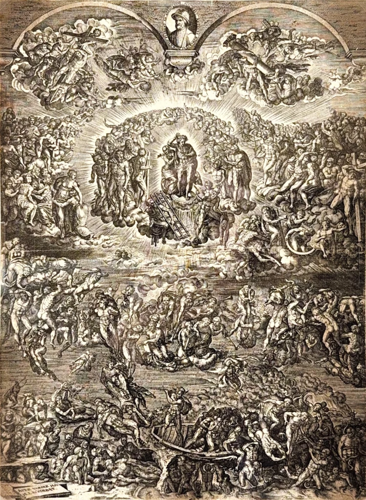 Miguel Ángel terminó de pintar el Juicio Final del ábside de la Capilla Sixtina, una de las obras maestras del Renacimiento italiano, en 1541. Este fresco se popularizó rápidamente gracias, en parte, a la difusión de grabados como este, de Jan Wierix, que reproduce con gran calidad y nivel de detalle la obra original, aunque sin la fuerza de su color.