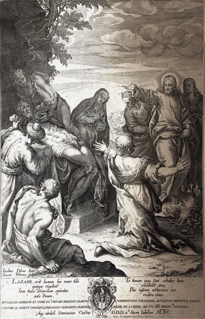 El célebre episodio de la resurrección de Lázaro, en presencia de sus hermanas Marta y María, protagoniza este grabado, cuya composición sigue una pintura italiana del mismo tema. Kilian representa con gran dramatismo la extracción del cuerpo de Lázaro del sepulcro, justo en el momento en que Jesús, de pie al otro lado, le ordena levantarse y caminar.