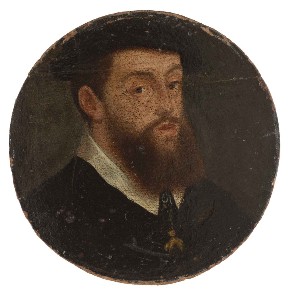 No sabem del cert l’autor ni la data d’aquest petit retrat de l’emperador. El format petit i rodó fa pensar en una pintura feta en el context d’un àmbit íntim i molt privat. De vegades, aquests retrats s’enviaven a familiars i amics per donar compte de l’estat i de l’aspecte de la persona retratada. Carles V vesteix a la moda espanyola de l’època i llueix, com a únic ornament, el collar amb el toisó d’or. És probable que fos pintat a Espanya, on aquest tipus de petits retrats eren molt populars.