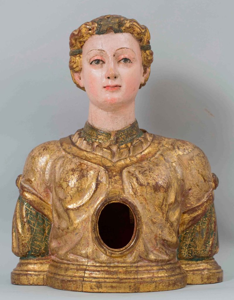 Desconeixem la identitat d’aquesta santa, així com la procedència geogràfica de la peça ni el seu emplaçament original. Tot i això, es tracta d’una fórmula molt habitual per guardar i exposar relíquies de santes i sants que es podien contemplar a través d’una petita finestra. El bust, de mida gairebé natural, és de fusta policromada i daurada. Cal destacar la portella pintada en color vermell, per accedir a l’interior des de la part posterior, així com el recollit del pentinat i el seu somriure discret.
