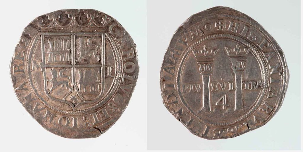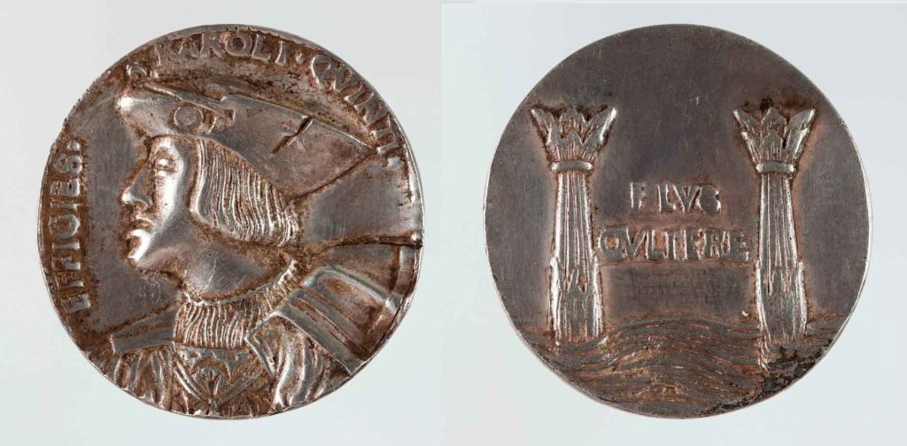 En aquesta medalla hi podem veure el retrat d’un Carles V molt jove, de vint anys, poc temps després de ser coronat rei i d’allotjar-se per primer cop en aquest palau, el 1519, quan es dirigia a Barcelona per jurar corts. El 30 de novembre d’aquell any, el jove rei va rebre en aquest palau l’ambaixada diplomàtica que li confirmava que havia estat escollit emperador, en successió del seu avi Maximilià I. Fruit d’aquesta primera estada del jove rei, va resultar-ne el matrimoni d’un capità de la seva guàrdia, Juan de Zúñiga Avellaneda, amb la jove Estefania de Requesens, i, anys després, el naixement del seu primogènit, Lluís de Requesens i de Zúñiga.