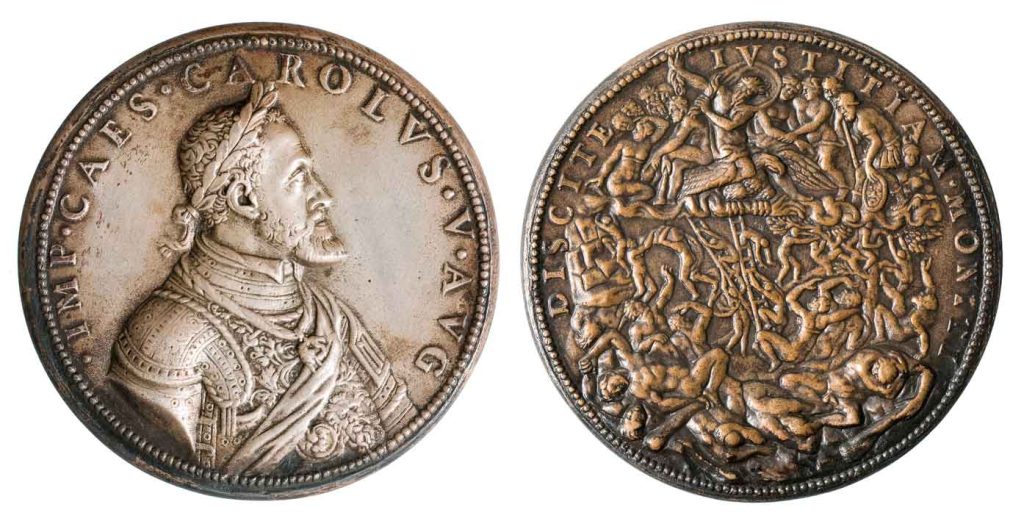 Carles V apareix aquí retratat amb gairebé cinquanta anys, vestit amb cuirassa i corona de llorer a l’estil dels grans emperadors de Roma. Aquesta medalla commemora la gran victòria de les seves tropes a la batalla de Mühlberg contra els protestants de la lliga d’Esmalcada. Podeu consultar el model en 3D d’aquesta peça, que us permetrà ampliar-la i veure-la pel revers, on es pot apreciar una composició complexa i rica en detalls, figures i accions que recorden de manera simbòlica aquell fet històric.