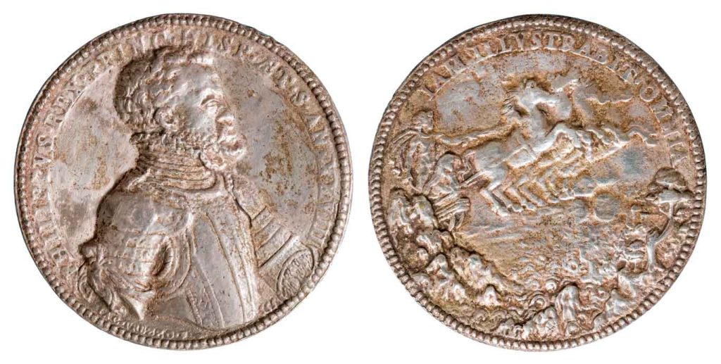 Felip II el Prudent va heretar del seu pare, Carles V, un imperi tan immens com complex de mantenir i gestionar. Aquesta medalla fou realitzada en commemoració de l’abdicació de l’emperador en favor del seu fill. Durant el seu regnat, Lluís de Requesens, company de joventut i de formació del príncep, l’ajudaria en el govern del seu imperi amb dos càrrecs de gran importància, com a governador del ducat de Milà, primer, i com a governador dels Països Baixos, després.