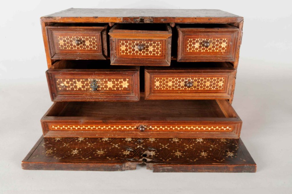 A l’època del Renaixement es produeix l’inici dels grans estats moderns, com Espanya i França, amb sistemes administratius i funcionarials cada cop més complexos. La cultura del paper es generalitza i la documentació escrita cada cop es torna més abundant i complexa: cartes, testaments, contractes i altres protocols notarials. Mobles com aquest (també conegut com a arquimesa) servien com a escriptoris portàtils amb calaixets per guardar-hi utensilis i altres objectes de valor.