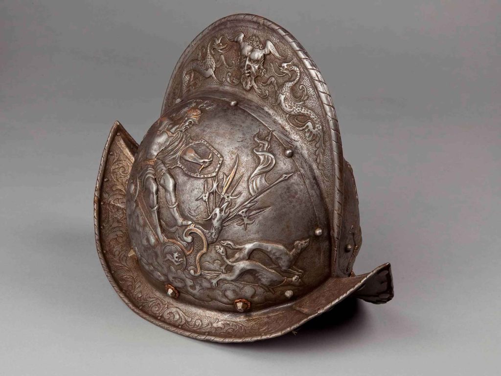 Aquest tipus de casc va ser molt popular als exèrcits al segle XVI, sobretot els hispànics. Amb les seves formes característicament corbades, protegia amb molta efectivitat les parts més exposades del rostre, com el nas i les orelles, però també les més vitals, com el coll i el crani, amb una cresta que també podia ser esmolada. Aquest casc en concret devia pertànyer, sens dubte, a un alt càrrec militar, per la rica decoració en relleu, refinada, de tipus classicista i de temàtica mitològica, amb la trobada de Mart i Venus, els déus romans de la guerra i de l’amor.