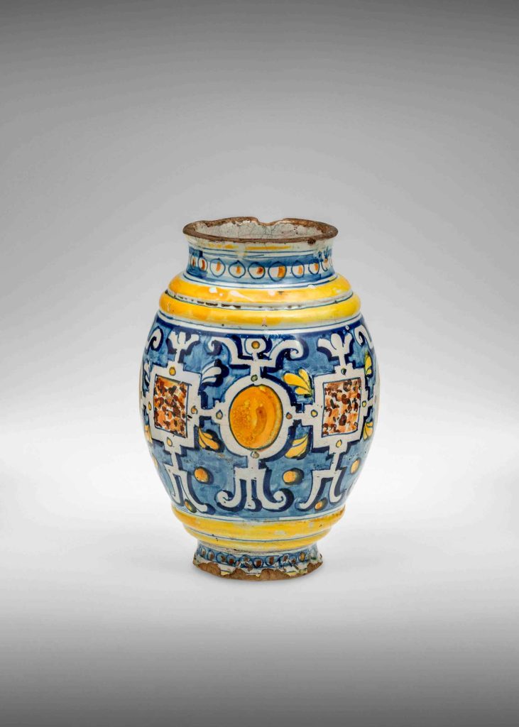 Fins al segle XVI, la ceràmica espanyola va estar molt influenciada per la tradició àrab. Talavera de la Reina va ser un dels centres productors més importants de l’època. Citada sovint per autors com Cervantes, Lope de Vega o Tirso de Molina, gaudia de gran prestigi però era d’ús habitual també entre les classes humils. Aquest exemple llueix una decoració característica, amb els colors blancs i blaus que la fan molt fàcilment identificable.
