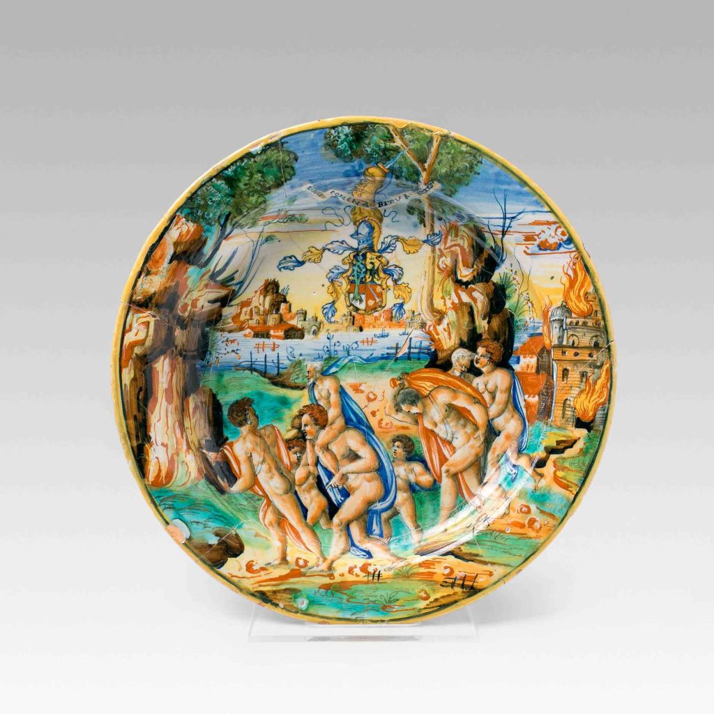 Andrea Negroponte va ser un famós i reputat ceramista italià, amb una llarga producció que avui es pot veure a diversos museus del món. En aquest plat hi veiem reproduïda una escena del mític incendi de la ciutat de Troia. En concret, hi podem veure com Enees fuig de la ciutat amb el seu pare, Anquises, a l’esquena, juntament amb altres personatges amb un estil naturalista, molt propi del Renaixement italià i que incorporava a la decoració ceràmica descobriments i fórmules del llenguatge pictòric, com la perspectiva i la profunditat dels paisatges.