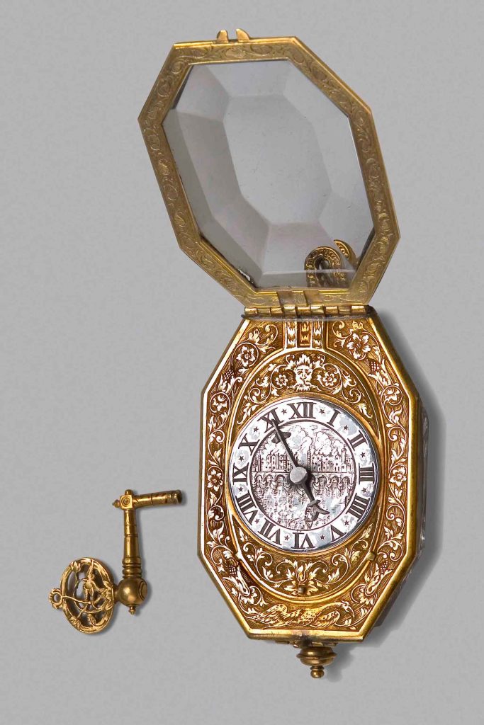 Aquest altre exemplar, també de la col·lecció Martí Estany, permet apreciar el valor de joia que podien arribar a tenir aquests primers rellotges de butxaca. En aquest cas, amb l’ús de cristall de roca a la tapadora i a la part posterior. A l’esfera, el rellotge presenta una curiosa escena marítima o fluvial, amb un pont i una ciutat al fons, i una barca que s’hi acosta remant, clarament identificable.