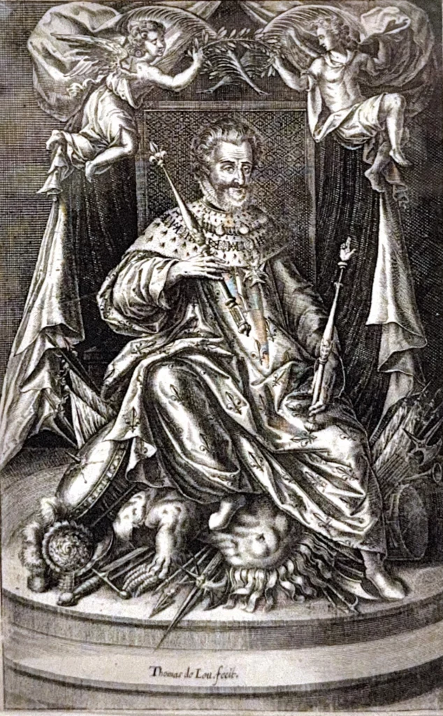 Aquest gravador francès d’origen flamenc va fer prop de 300 retrats de diversos personatges il·lustres de l’època. En aquest, el rei Enric IV de França (1553-1610) apareix assegut al seu tron, vestit amb solemnitat, amb el ceptre i la vara de comandament, mentre dos putti el coronen amb llorer, com a símbol del seu poder.