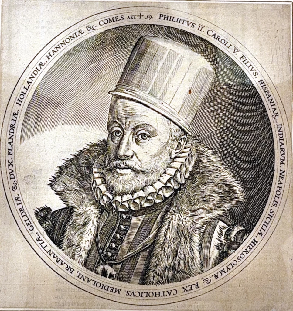 El rei Felip II (1527-1598) apareix retratat en aquest gravat a una edat avançada, segurament la seixantena, dins d’un tondo circular amb una inscripció al voltant que l’identifica com a sobirà de tots els territoris que posseïa la corona espanyola en aquell moment. Llueix el collar del Toisó d’Or i va cobert amb un capell de copa. És interessant destacar que l’any 1532, quan era jove i encara príncep, Felip va allotjar-se al Palau de Requesens, a Molins de Rei, en el seu camí cap a Barcelona.