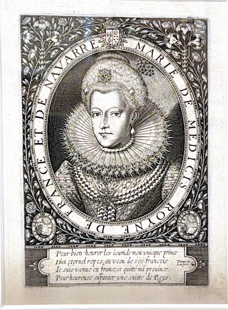 Maria de Mèdici (1575-1642) va ser reina consort de França i de Navarra, tal com s’indica a l’oval que emmarca el retrat. Persona il·lustrada i culta, va ser una gran col·leccionista d’obres d’art i mecenes d’artistes com Guido Reni o Rubens. En aquest gravat, Leu demostra el seu gran talent com a dibuixant, però també amb l’ús de la línia com a recurs per aconseguir efectes delicats en els detalls i les textures.